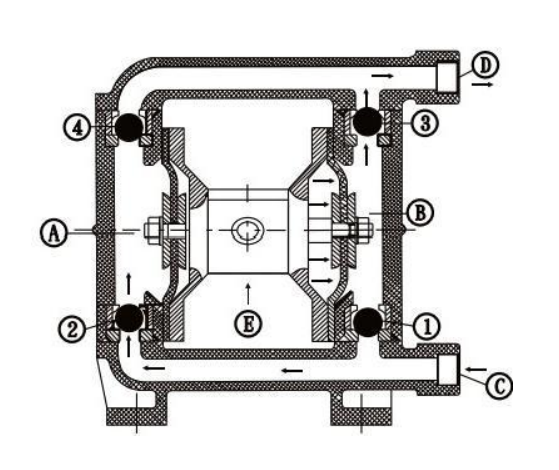 2. Жидкость всасывается через впускное отверстие ③ при расширении секции A. Когда жидкость попадает в секцию ④, шаровой клапан ② открывается, а клапан ④ закрывается.