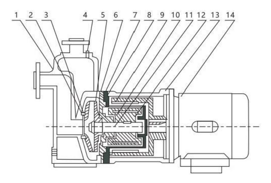 | 1 | Корпус насоса | 5 | Рабочее колесо | 9 | Внешний магнитный узел | 13 | Соединительная рама |